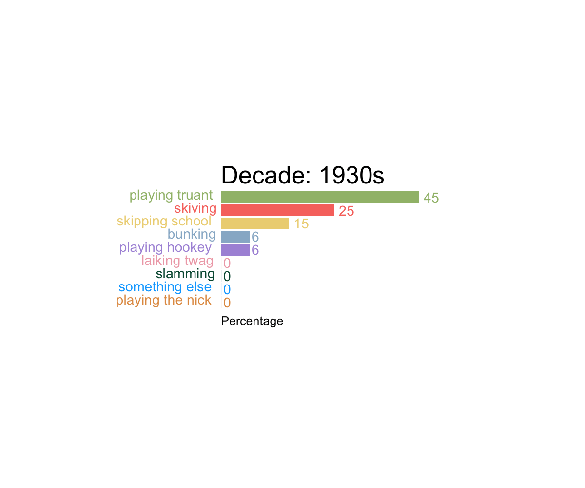 A whole host of other terms used around the country were also contributed by respondents. In Manchester, you might be caught wagging, whereas you’d be accused of sagging in Liverpool. In North Lincolnshire and the East Riding, you may be found twagging, but are less likely to be laiking twag, as this term seems to be on the decline in the area. Further up the country, in Middlesbrough, you may confess to nicking, or playing the nick in neighbouring Durham