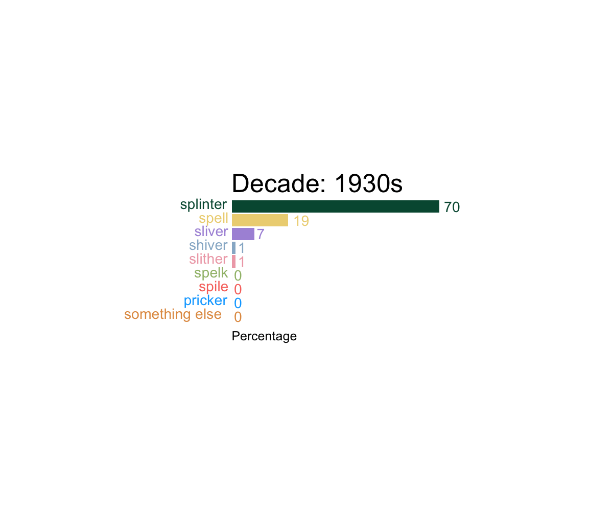 The word spelk was shared by 6% of respondents, the majority of who grew up in the northeast. The word continues to be used across all generations, bar those aged under 11. People described a spell across a range of regions, including Middlesbrough, Hull, North Lincolnshire, Sheffield, and across the Pennines into Huddersfield, Manchester, Blackburn and Burnley, and up through to Cumbria. Spell is, however, less common amongst young people than amongst their older counterparts. Meanwhile, if you venture into southern Lincolnshire and the northern Fenlands of East Anglia, your finger might be victim to a shiver.